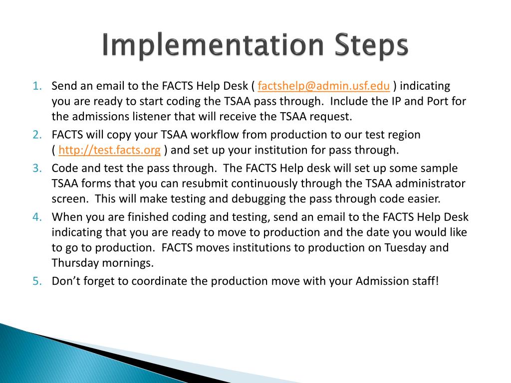 Implementation Steps • Send an email to the FACTS Help Desk ( factshelp@admin.usf.edu ) indicating you are ready to start coding the TSAA pass through. Include the IP and Port for the admissions listener that will receive the TSAA request. • FACTS will copy your TSAA workflow from production to our test region ( http://test.facts.org ) and set up your institution for pass through. • Code and test the pass through. The FACTS Help desk will set up some sample TSAA forms that you can resubmit continuously through the TSAA administrator screen. This will make testing and debugging the pass through code easier. • When you are finished coding and testing, send an email to the FACTS Help Desk indicating that you are ready to move to production and the date you would like to go to production. FACTS moves institutions to production on Tuesday and Thursday mornings. • Don’t forget to coordinate the production move with your Admission staff!