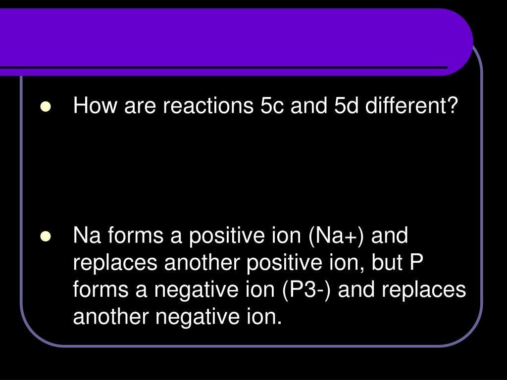 How are reactions 5c and 5d different? • Na forms a positive ion (Na+) and replaces another positive ion, but P forms a negative ion (P3-) and replaces another negative ion.