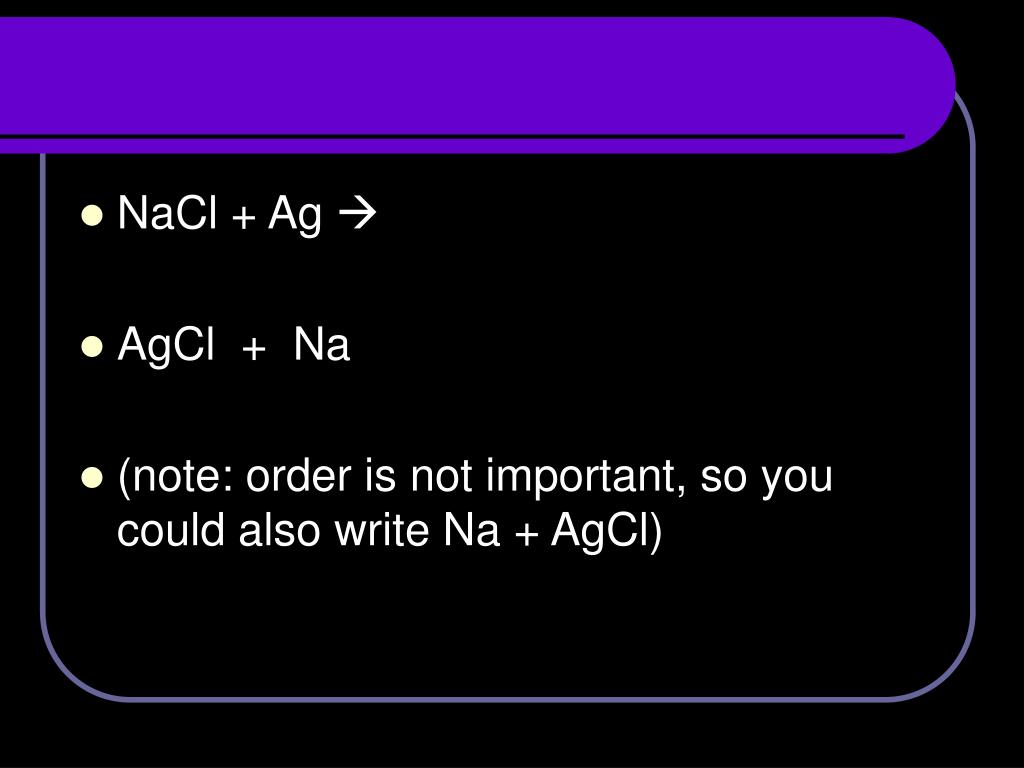 NaCl + Ag • AgCl + Na • (note: order is not important, so you could also write Na + AgCl)
