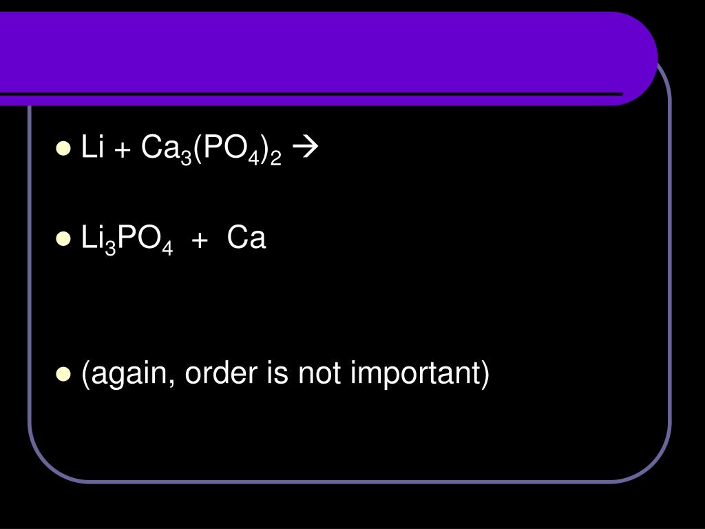 Li + Ca3(PO4)2 • Li3PO4 + Ca • (again, order is not important)