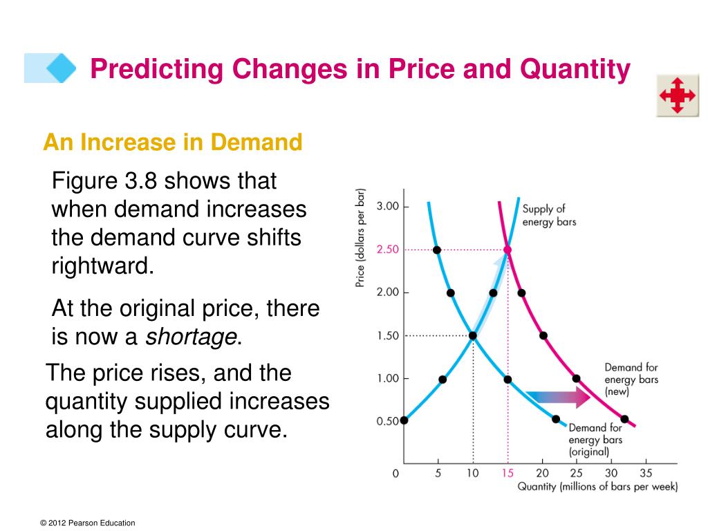 Predicting Changes in Price and Quantity • An Increase in Demand • Figure 3.8 shows that when demand increases the demand curve shifts rightward. • At the original price, there is now a shortage. The price rises, and the quantity supplied increases along the supply curve.