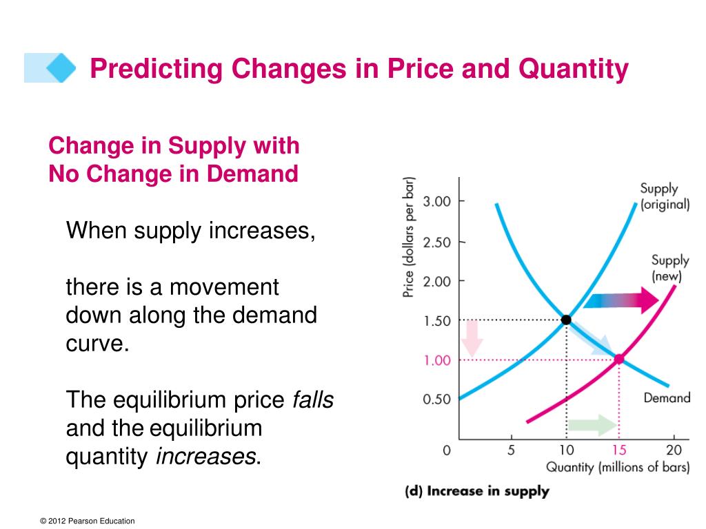 Predicting Changes in Price and Quantity • Change in Supply with No Change in Demand • When supply increases, • there is a movement down along the demand curve. • The equilibrium price falls and theequilibrium quantity increases.