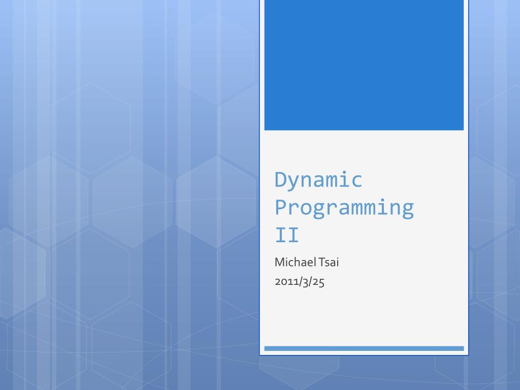 Dynamic Programming II. Michael Tsai 2011/3/25. 上課 !. 假如我們有點記性的話 …. 空間換取時間 做過的事情就不要再 做 “ 記得結果 ” 就好 : 填表與查表 Dynamic programming: 這裡 的 programming 指填表 , 不是寫程式 當 所有不同的 subprogram 數目是 polynomial, 及 解掉 subprogram 的時間也是 polynomial, dynamic programming 方法可以在 polynomial time 內完成.