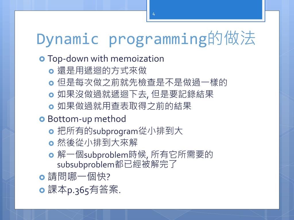 Dynamic programming的做法 • Top-down with memoization • 還是用遞迴的方式來做 • 但是每次做之前就先檢查是不是做過一樣的 • 如果沒做過就遞迴下去, 但是要記錄結果 • 如果做過就用查表取得之前的結果 • Bottom-up method • 把所有的subprogram從小排到大 • 然後從小排到大來解 • 解一個subproblem時候, 所有它所需要的subsubproblem都已經被解完了 • 請問哪一個快? • 課本p.365有答案.