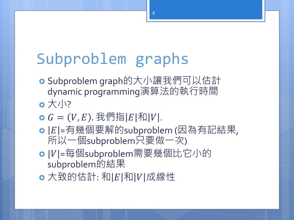 Subproblem graphs • Subproblem graph的大小讓我們可以估計dynamic programming演算法的執行時間 • 大小? • 我們指和. • =有幾個要解的subproblem (因為有記結果, 所以一個subproblem只要做一次) • =每個subproblem需要幾個比它小的subproblem的結果 • 大致的估計: 和和成線性