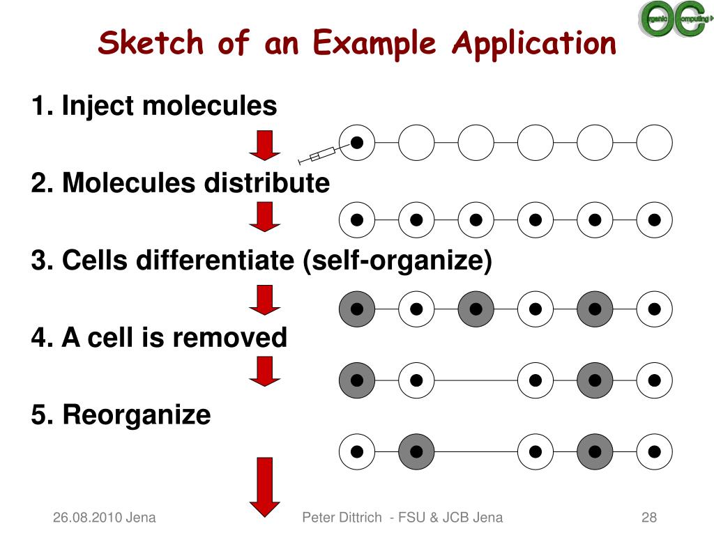 Sketch of an Example Application 1. Inject molecules 2. Molecules distribute 3. Cells differentiate (self-organize) 4. A cell is removed 5. Reorganize Peter Dittrich - FSU & JCB Jena