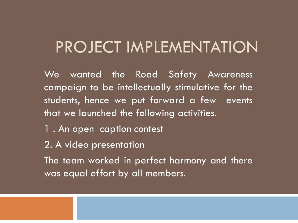 PROJECT IMPLEMENTATION We wanted the Road Safety Awareness campaign to be intellectually stimulative for the students, hence we put forward a few events that we launched the following activities. 1 . An open caption contest 2. A video presentation The team worked in perfect harmony and there was equal effort by all members.