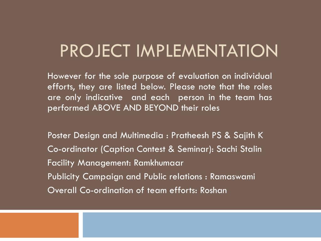 PROJECT IMPLEMENTATION However for the sole purpose of evaluation on individual efforts, they are listed below. Please note that the roles are only indicative and each person in the team has performed ABOVE AND BEYOND their roles Poster Design and Multimedia : Pratheesh PS & Sajith K Co-ordinator (Caption Contest & Seminar): Sachi Stalin Facility Management: Ramkhumaar Publicity Campaign and Public relations : Ramaswami Overall Co-ordination of team efforts: Roshan