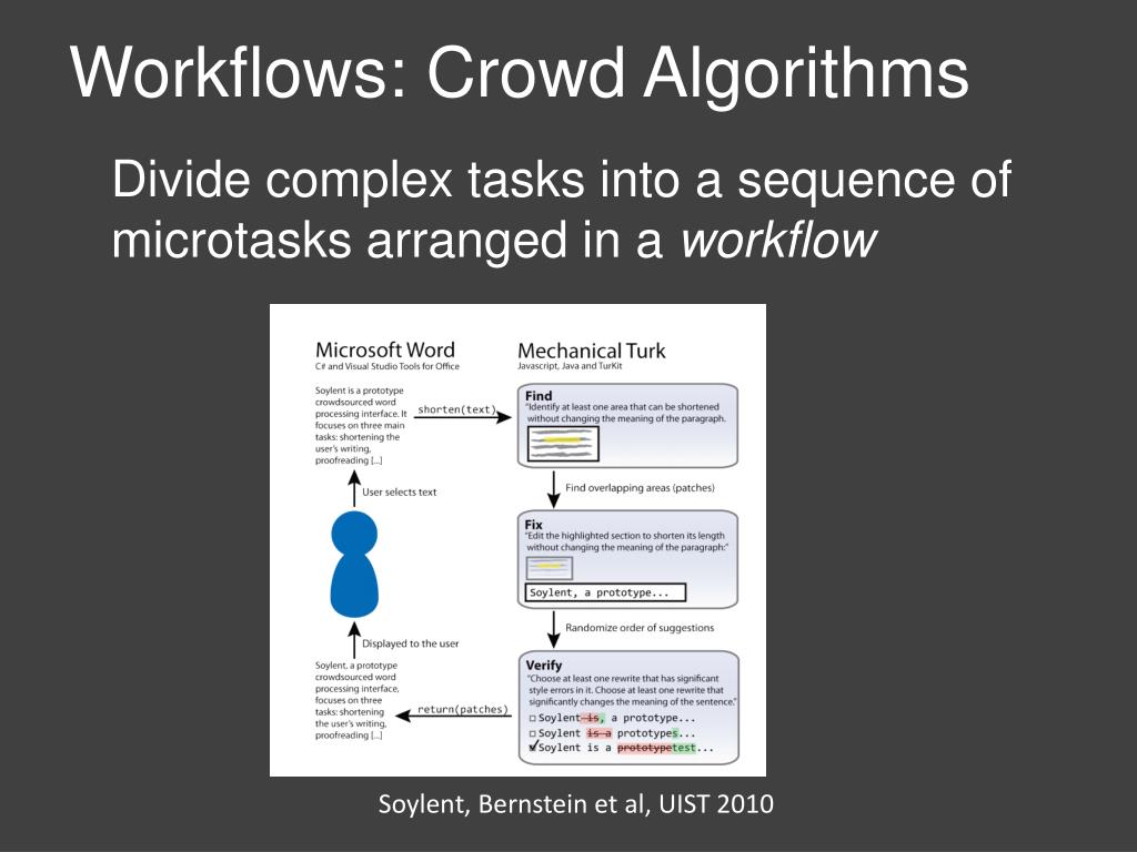 Workflows: Crowd Algorithms Divide complex tasks into a sequence of microtasks arranged in a workflow Soylent, Bernstein et al, UIST 2010