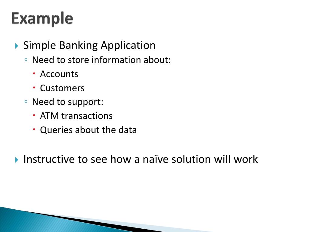 Example • Simple Banking Application • Need to store information about: • Accounts • Customers • Need to support: • ATM transactions • Queries about the data • Instructive to see how a naïve solution will work