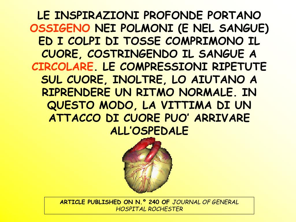 LE INSPIRAZIONI PROFONDE PORTANO OSSIGENO NEI POLMONI (E NEL SANGUE) ED I COLPI DI TOSSE COMPRIMONO IL CUORE, COSTRINGENDO IL SANGUE A CIRCOLARE. LE COMPRESSIONI RIPETUTE SUL CUORE, INOLTRE, LO AIUTANO A RIPRENDERE UN RITMO NORMALE. IN QUESTO MODO, LA VITTIMA DI UN ATTACCO DI CUORE PUO’ ARRIVARE ALL’OSPEDALE ARTICLE PUBLISHED ON N.º 240 OF JOURNAL OF GENERAL HOSPITAL ROCHESTER