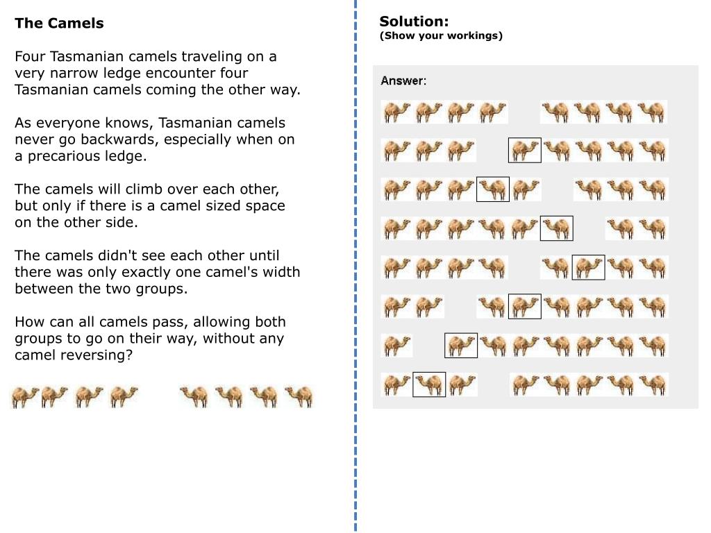 The Camels Four Tasmanian camels traveling on a very narrow ledge encounter four Tasmanian camels coming the other way. As everyone knows, Tasmanian camels never go backwards, especially when on a precarious ledge. The camels will climb over each other, but only if there is a camel sized space on the other side. The camels didn't see each other until there was only exactly one camel's width between the two groups. How can all camels pass, allowing both groups to go on their way, without any camel reversing? Solution: (Show your workings)