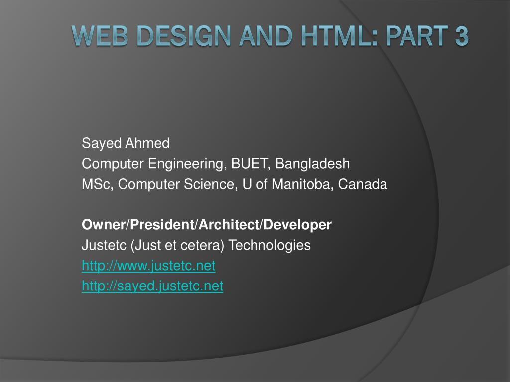 Sayed Ahmed Computer Engineering, BUET, Bangladesh MSc, Computer Science, U of Manitoba, Canada Owner/President/Architect/Developer Justetc (Just et cetera) Technologies http://www.justetc.net http://sayed.justetc.net Web design and HTML: Part 3