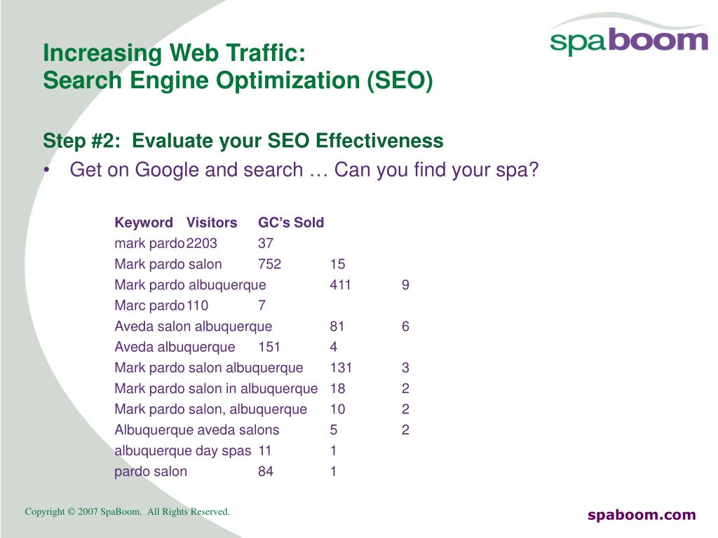 Increasing Web Traffic:Search Engine Optimization (SEO) Step #2: Evaluate your SEO Effectiveness • Get on Google and search … Can you find your spa? Keyword Visitors GC’s Sold mark pardo 2203 37 Mark pardo salon 752 15 Mark pardo albuquerque 411 9 Marc pardo 110 7 Aveda salon albuquerque 81 6 Aveda albuquerque 151 4 Mark pardo salon albuquerque 131 3 Mark pardo salon in albuquerque 18 2 Mark pardo salon, albuquerque 10 2 Albuquerque aveda salons 5 2 albuquerque day spas 11 1 pardo salon 84 1