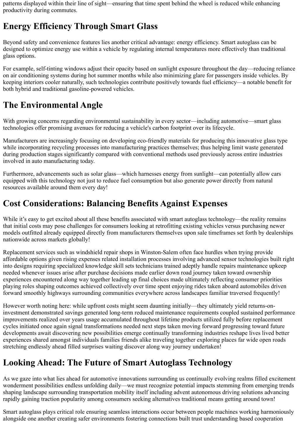 patterns displayed within their line of sight—ensuring that time spent behind the wheel is reduced while enhancing productivity during commutes. Energy Efficiency Through Smart Glass Beyond safety and convenience features lies another critical advantage: energy efficiency. Smart autoglass can be designed to optimize energy use within a vehicle by regulating internal temperatures more effectively than traditional glass options. For example, self-tinting windows adjust their opacity based on sunlight exposure throughout the day—reducing reliance on air conditioning systems during hot summer months while also minimizing glare for passengers inside vehicles. By keeping interiors cooler naturally, such technologies contribute positively towards fuel efficiency—a notable benefit for both hybrid and traditional gasoline-powered vehicles. The Environmental Angle With growing concerns regarding environmental sustainability in every sector—including automotive—smart glass technologies offer promising avenues for reducing a vehicle's carbon footprint over its lifecycle. Manufacturers are increasingly focusing on developing eco-friendly materials for producing this innovative glass type while incorporating recycling processes into manufacturing practices themselves; thus helping limit waste generated during production stages significantly compared with conventional methods used previously across entire industries involved in auto manufacturing today. Furthermore, advancements such as solar glass—which harnesses energy from sunlight—can potentially allow cars equipped with this technology not just to reduce fuel consumption but also generate power directly from natural resources available around them every day! Cost Considerations: Balancing Benefits Against Expenses While it’s easy to get excited about all these benefits associated with smart autoglass technology—the reality remains that initial costs may pose challenges for consumers looking at retrofitting existing vehicles versus purchasing newer models outfitted already equipped directly from manufacturers themselves upon sale timeframes set forth by dealerships nationwide across markets globally! Replacement services such as windshield repair shops in Winston-Salem often face hurdles when trying provide affordable options given rising expenses related installation processes involving advanced sensor technologies built right into designs requiring specialized knowledge skill sets technicians trained adeptly handle repairs maintenance upkeep needed whenever issues arise after purchase decisions made earlier down road journey taken toward ownership experiences encountered along way together leading up final choices made ultimately reflecting consumer priorities playing roles shaping outcomes achieved collectively over time spent enjoying rides taken aboard automobiles driven forward smoothly highways surrounding communities everywhere across landscapes familiar traversed frequently! However worth noting here: while upfront costs might seem daunting initially—they ultimately yield returns-on- investment demonstrated savings generated long-term reduced maintenance requirements coupled sustained performance improvements realized over years usage accumulated throughout lifetime products utilized fully before replacement cycles initiated once again signal transformations needed next steps taken moving forward progressing toward future developments await discovering new possibilities emerge continually transforming industries reshape lives lived better experiences shared amongst individuals families friends alike traveling together exploring places far wide open roads stretching endlessly ahead filled surprises waiting discover along way journey undertaken! Looking Ahead: The Future of Smart Autoglass Technology As we gaze into what lies ahead for automotive innovations surrounding us continually evolving realms filled excitement wonderment possibilities endless unfolding daily—we must recognize potential impacts stemming from emerging trends shaping landscape surrounding transportation mobility itself including advent autonomous driving solutions advancing rapidly gaining traction popularity among consumers seeking alternatives traditional means getting around town! Smart autoglass plays critical role ensuring seamless interactions occur between people machines working harmoniously alongside one another creating safer environments fostering connections built trust understanding based cooperation