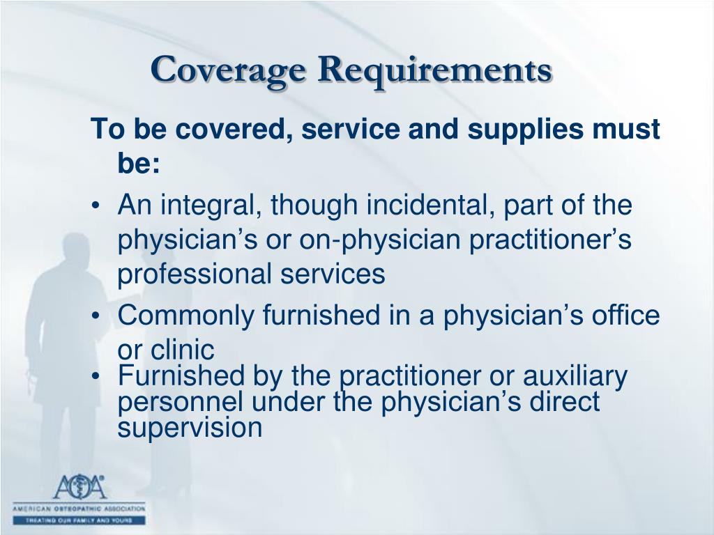 Coverage Requirements To be covered, service and supplies must be: • An integral, though incidental, part of the physician’s or on-physician practitioner’s professional services • Commonly furnished in a physician’s office or clinic • Furnished by the practitioner or auxiliary personnel under the physician’s direct supervision