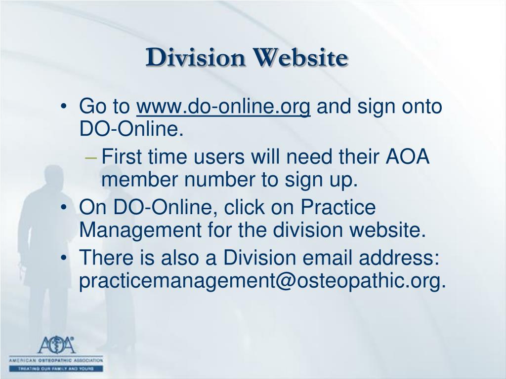 Division Website • Go to www.do-online.org and sign onto DO-Online. • First time users will need their AOA member number to sign up. • On DO-Online, click on Practice Management for the division website. • There is also a Division email address: practicemanagement@osteopathic.org.