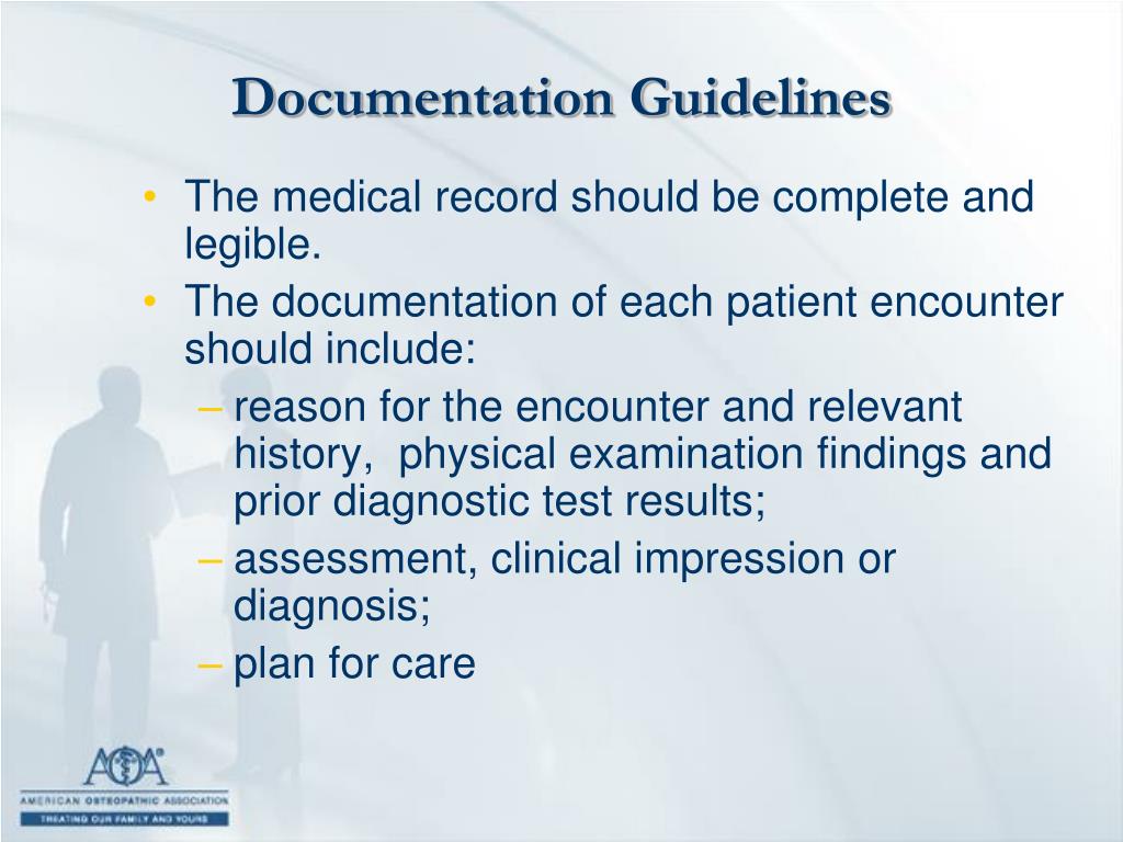 Documentation Guidelines • The medical record should be complete and legible. • The documentation of each patient encounter should include: • reason for the encounter and relevant history, physical examination findings and prior diagnostic test results; • assessment, clinical impression or diagnosis; • plan for care