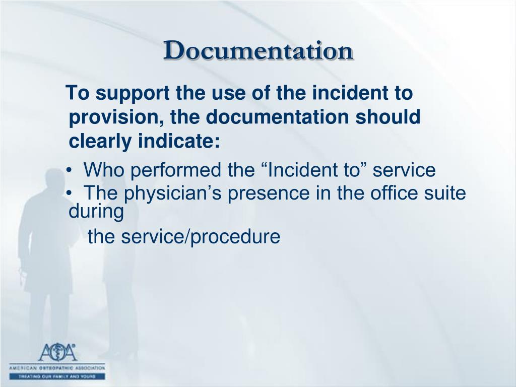 Documentation To support the use of the incident to provision, the documentation should clearly indicate: • Who performed the “Incident to” service • The physician’s presence in the office suite during the service/procedure