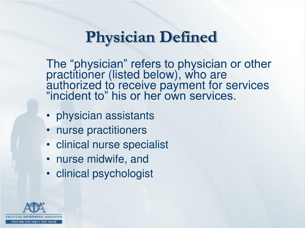 Physician Defined The “physician” refers to physician or other practitioner (listed below), who are authorized to receive payment for services “incident to” his or her own services. • physician assistants • nurse practitioners • clinical nurse specialist • nurse midwife, and • clinical psychologist