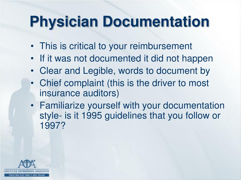 Physician Documentation • This is critical to your reimbursement • If it was not documented it did not happen • Clear and Legible, words to document by • Chief complaint (this is the driver to most insurance auditors) • Familiarize yourself with your documentation style- is it 1995 guidelines that you follow or 1997?