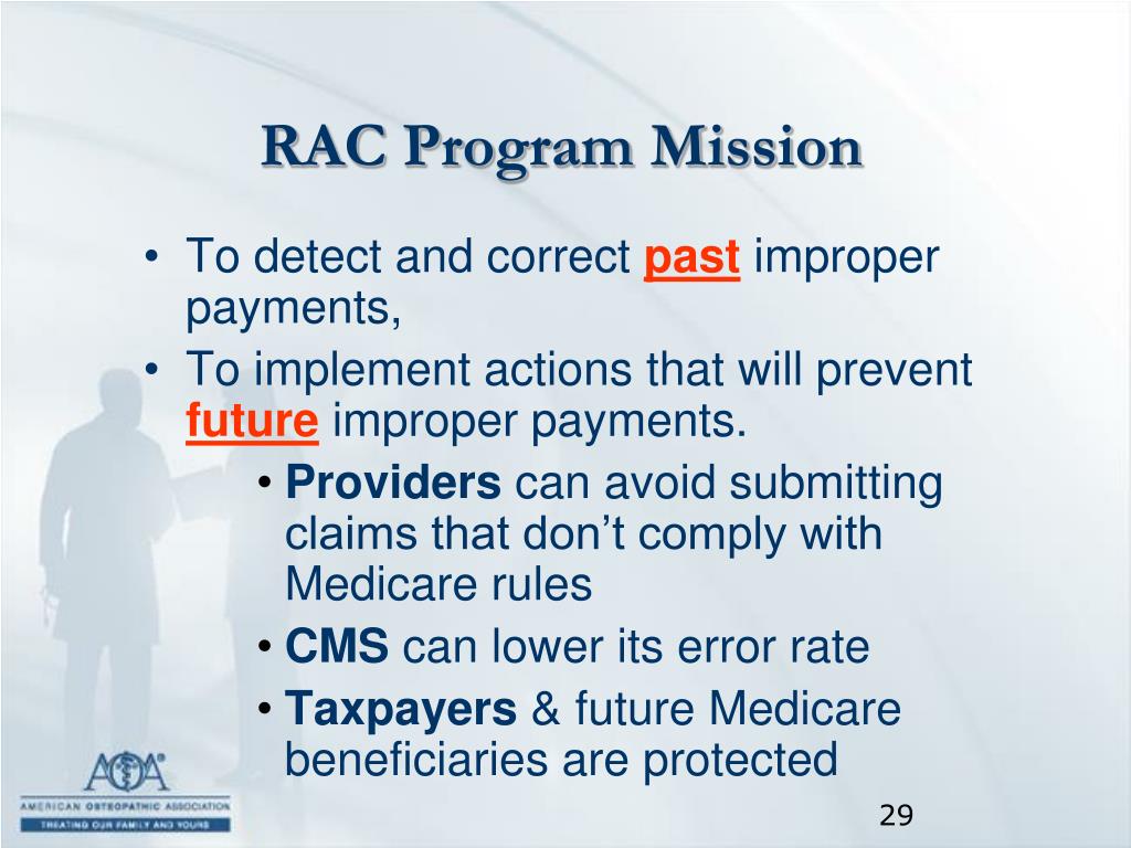 RAC Program Mission To detect and correct past improper payments, To implement actions that will preventfutureimproper payments. Providers can avoid submitting claims that don’t comply with Medicare rules CMS can lower its error rate Taxpayers & future Medicare beneficiaries are protected 29