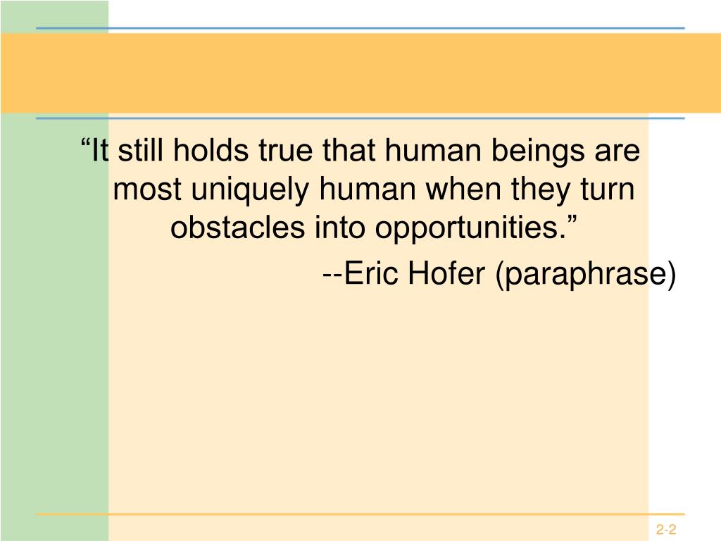 Entrepreneurship. Entrepreneurial Opportunities: Their Origins, Forms, and Suitability for New Ventures. 2. “It still holds true that human beings are most uniquely human when they turn obstacles into opportunities.” --Eric Hofer (paraphrase). Entrepreneurial Opportunity.