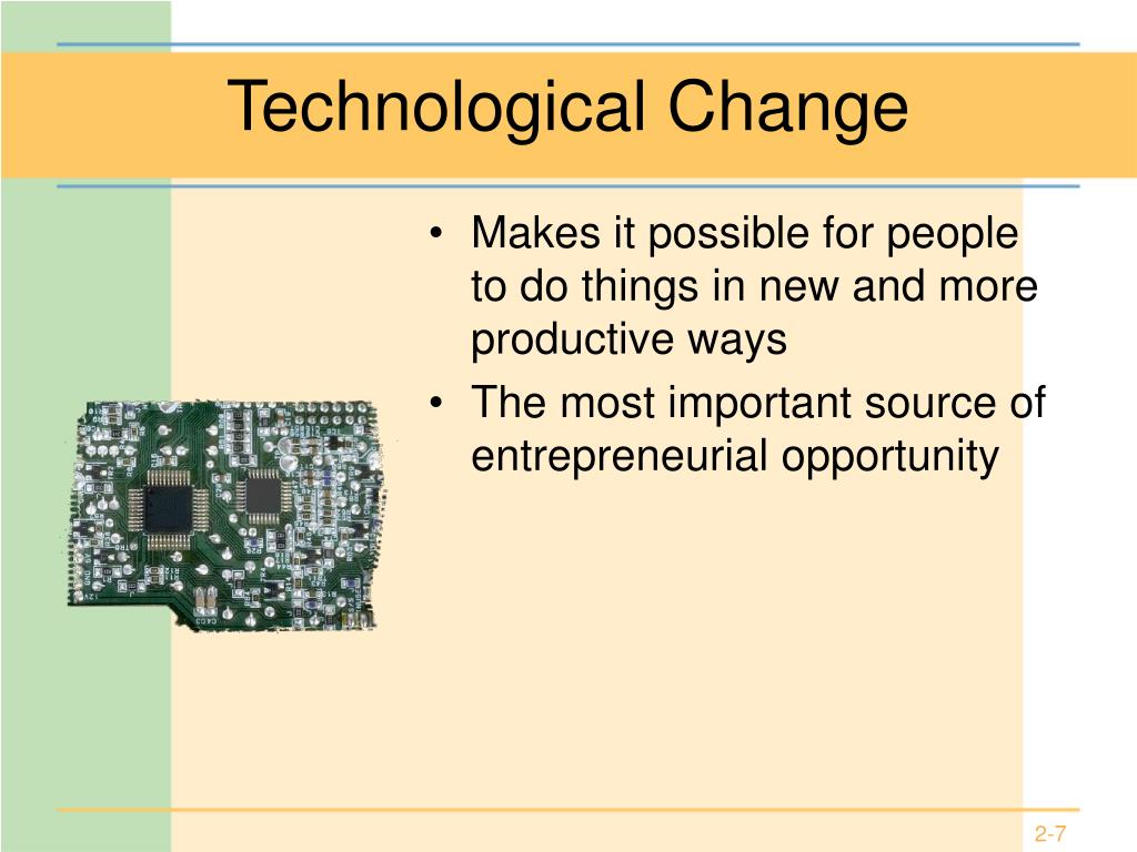 Technological Change • Makes it possible for people to do things in new and more productive ways • The most important source of entrepreneurial opportunity