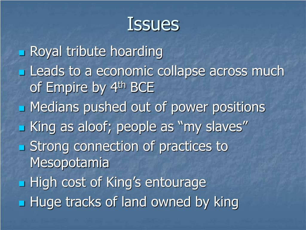 Issues • Royal tribute hoarding • Leads to a economic collapse across much of Empire by 4th BCE • Medians pushed out of power positions • King as aloof; people as “my slaves” • Strong connection of practices to Mesopotamia • High cost of King’s entourage • Huge tracks of land owned by king