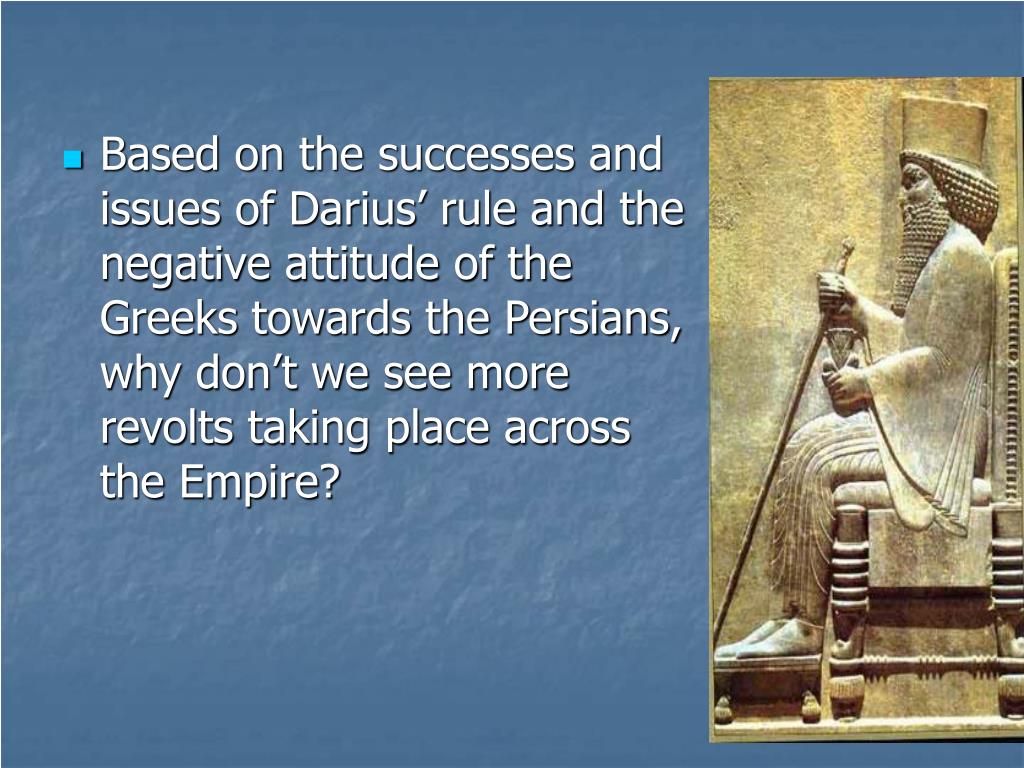 Based on the successes and issues of Darius’ rule and the negative attitude of the Greeks towards the Persians, why don’t we see more revolts taking place across the Empire?