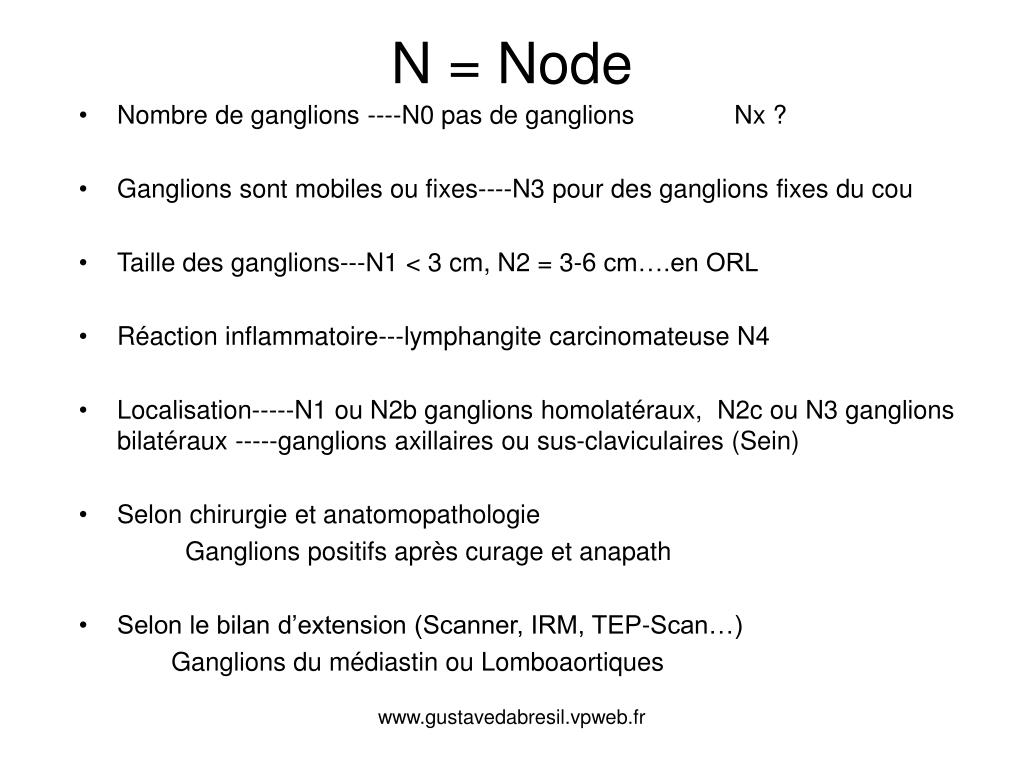 N = Node • Nombre de ganglions ----N0 pas de ganglions Nx ? • Ganglions sont mobiles ou fixes----N3 pour des ganglions fixes du cou • Taille des ganglions---N1 < 3 cm, N2 = 3-6 cm….en ORL • Réaction inflammatoire---lymphangite carcinomateuse N4 • Localisation-----N1 ou N2b ganglions homolatéraux, N2c ou N3 ganglions bilatéraux -----ganglions axillaires ou sus-claviculaires (Sein) • Selon chirurgie et anatomopathologie Ganglions positifs après curage et anapath • Selon le bilan d’extension (Scanner, IRM, TEP-Scan…) Ganglions du médiastin ou Lomboaortiques www.gustavedabresil.vpweb.fr