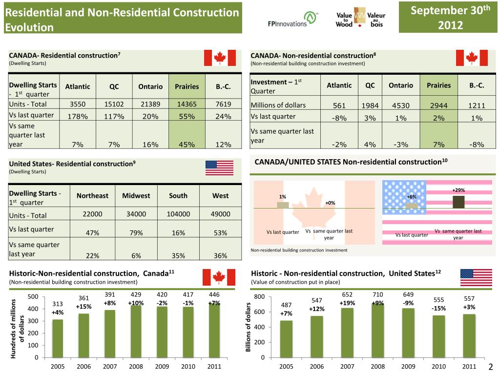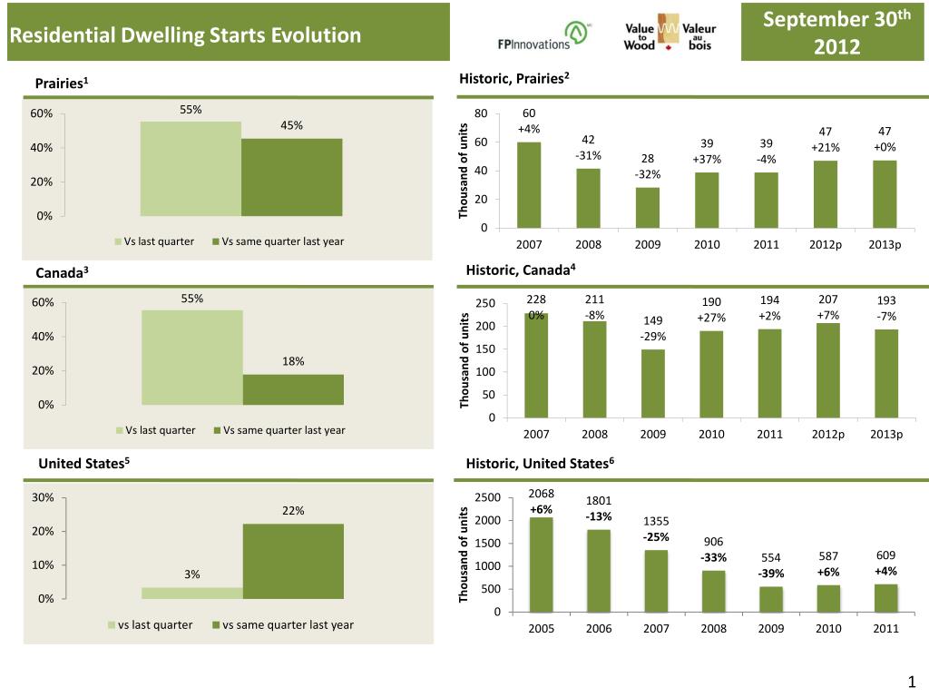September 30 th 2012. Residential Dwelling Starts Evolution. Historic , Prairies 2. Prairies 1. Historic , Canada 4. Canada 3. United States 5. Historic, United States 6. 1. September 30 th 2012. Residential and Non-Residential Construction Evolution. June 30 th 2012.