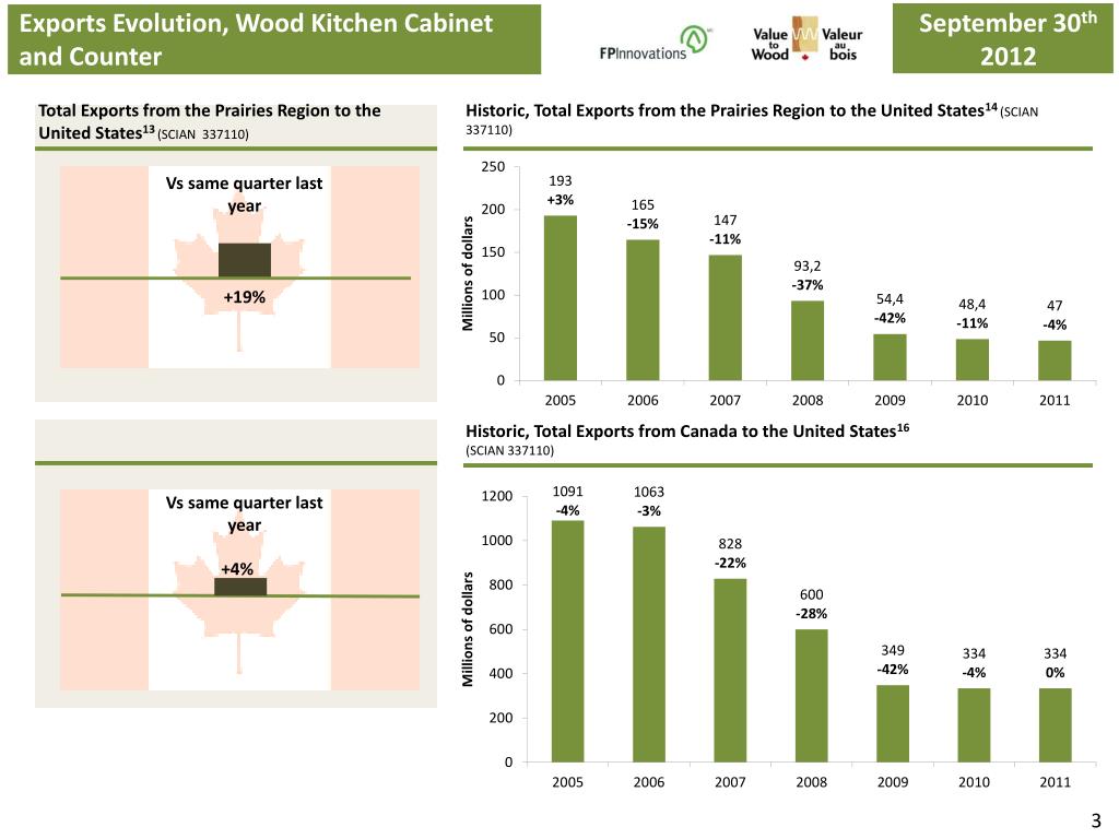 Exports Evolution, Wood Kitchen Cabinet and Counter September30th 2012 June30th 2012 Total Exports from the Prairies Region to the United States13 (SCIAN 337110) Historic, Total Exports from the Prairies Region to the United States14 (SCIAN 337110) Vs same quarter last year +19% Historic, Total Exports from Canada to the United States16 (SCIAN 337110) Vs same quarter last year +4% 3
