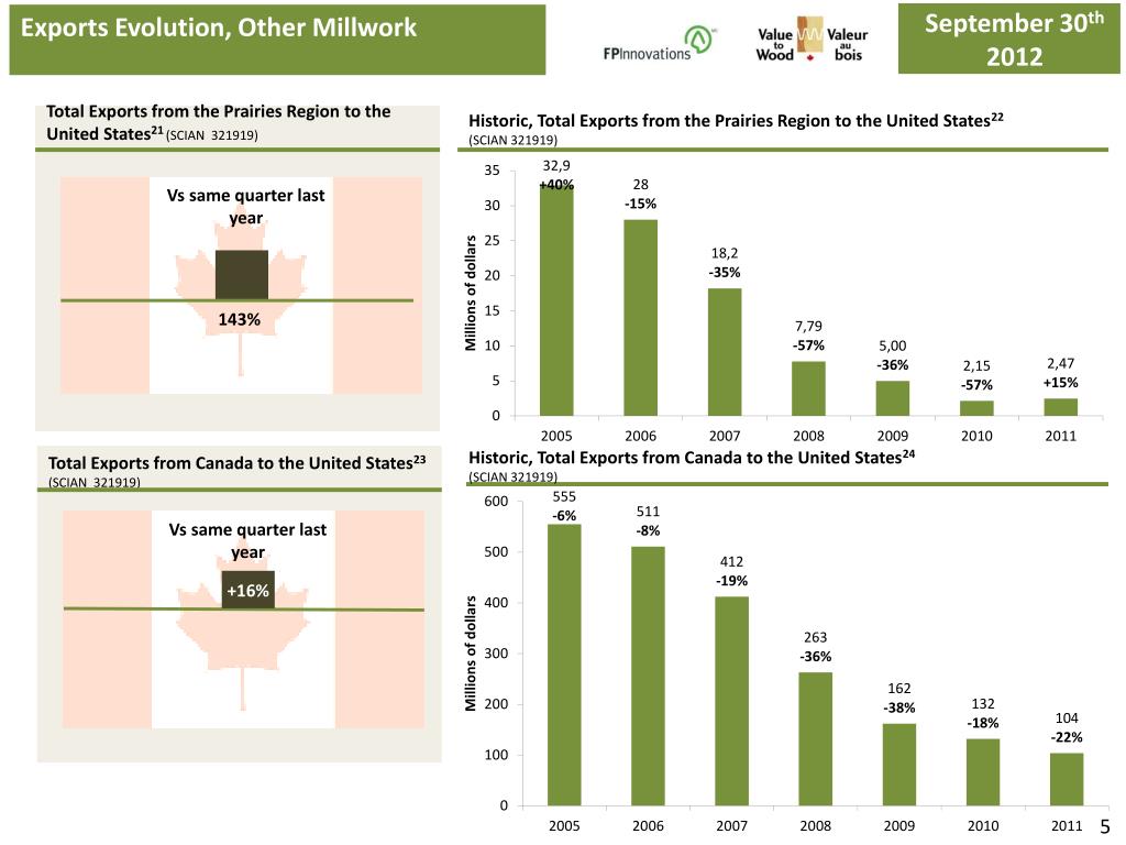 September30th 2012 Exports Evolution, Other Millwork June30th 2012 Total Exports from the Prairies Region to the United States21(SCIAN 321919) Historic, Total Exports from the Prairies Region to the United States22 (SCIAN 321919) Vs same quarter last year 143% Historic, Total Exports from Canada to the United States24 (SCIAN 321919) Total Exports from Canada to the United States23 (SCIAN 321919) Vs same quarter last year +16% 5