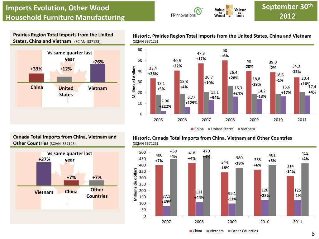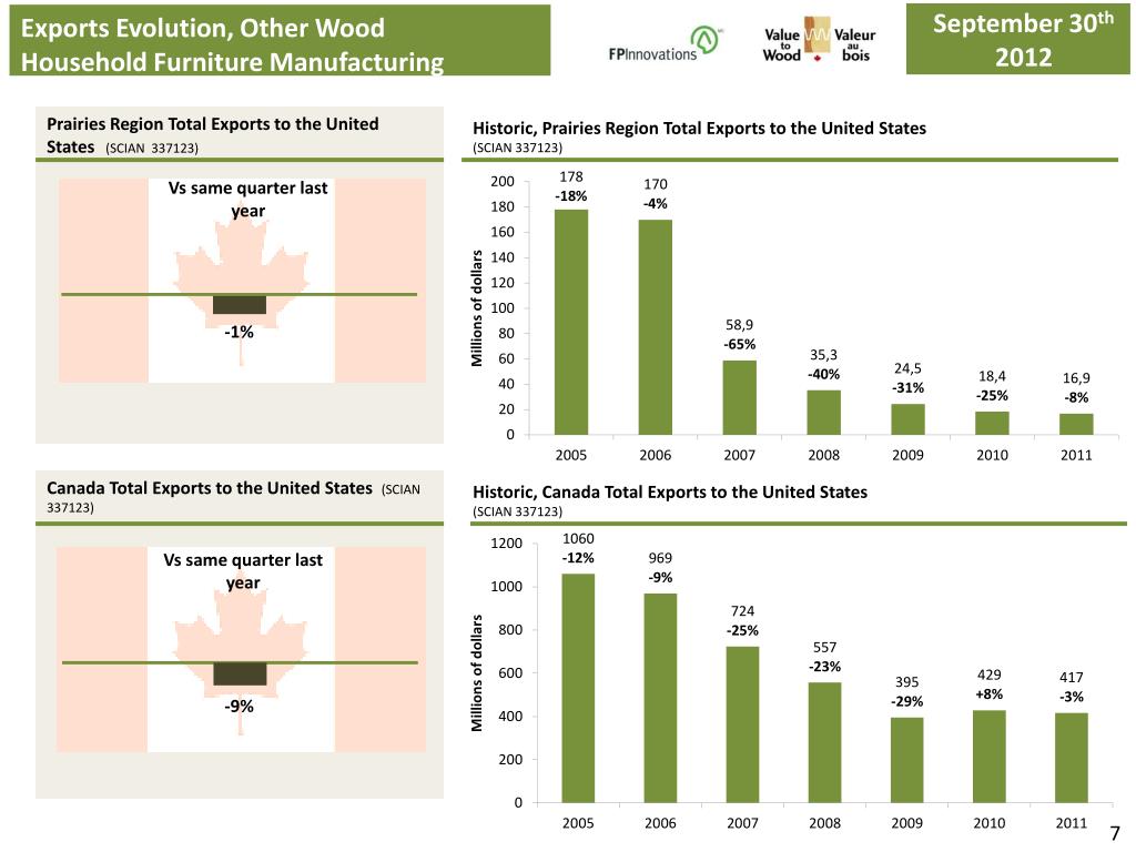 September30th 2012 Exports Evolution, Other Wood Household Furniture Manufacturing June30th 2012 Prairies Region Total Exports to the United States(SCIAN 337123) Historic, Prairies Region Total Exports to the United States (SCIAN 337123) Vs same quarter last year -1% Canada Total Exports to the United States (SCIAN 337123) Historic, Canada Total Exports to the United States (SCIAN 337123) Vs same quarter last year -9% 7