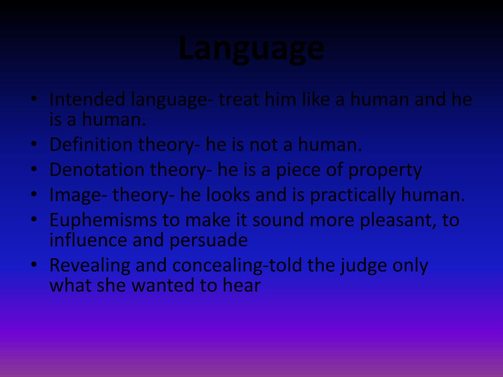 Language • Intended language- treat him like a human and he is a human. • Definition theory- he is not a human. • Denotation theory- he is a piece of property • Image- theory- he looks and is practically human. • Euphemisms to make it sound more pleasant, to influence and persuade • Revealing and concealing-told the judge only what she wanted to hear