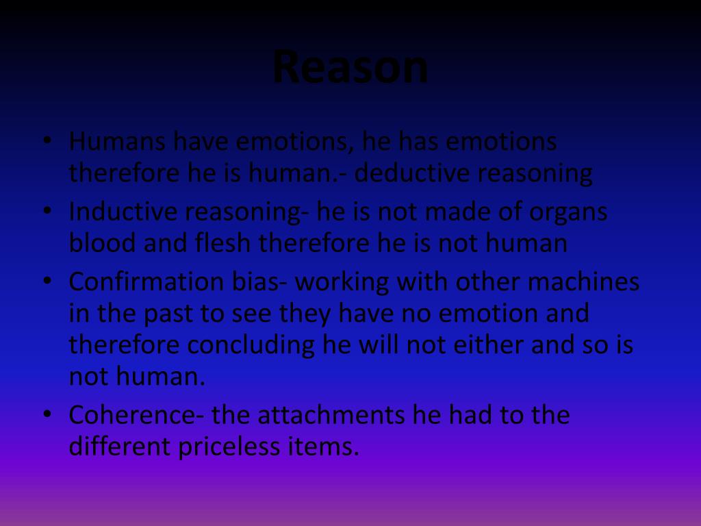 Reason • Humans have emotions, he has emotions therefore he is human.- deductive reasoning • Inductive reasoning- he is not made of organs blood and flesh therefore he is not human • Confirmation bias- working with other machines in the past to see they have no emotion and therefore concluding he will not either and so is not human. • Coherence- the attachments he had to the different priceless items.