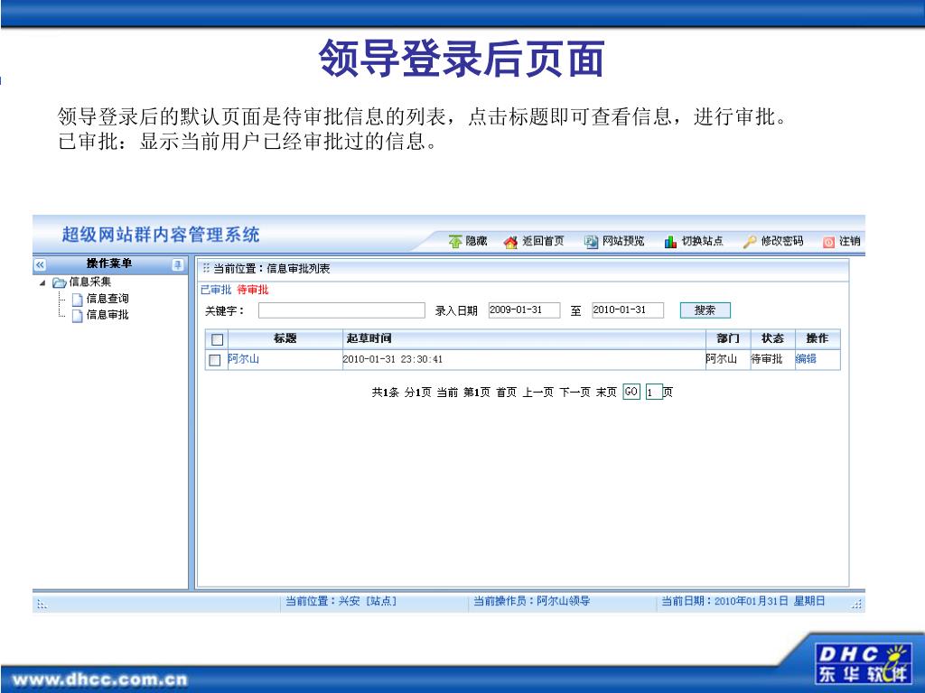 领导登录后页面 领导登录后的默认页面是待审批信息的列表,点击标题即可查看信息,进行审批。已审批:显示当前用户已经审批过的信息。