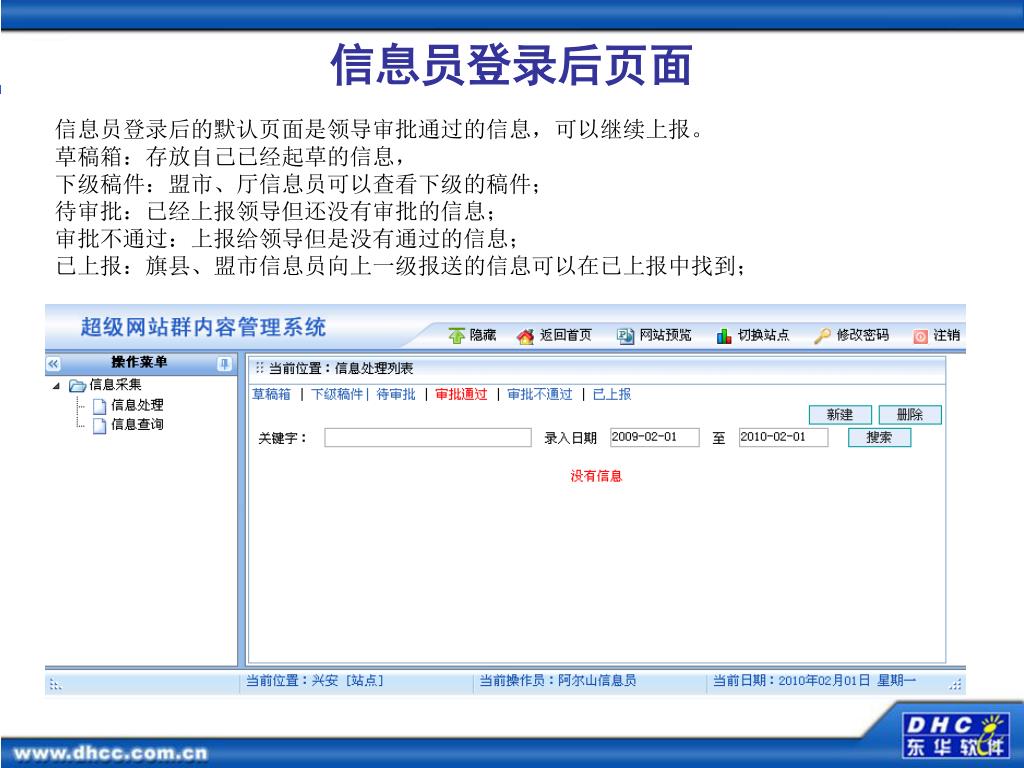 信息员登录后页面 信息员登录后的默认页面是领导审批通过的信息,可以继续上报。草稿箱:存放自己已经起草的信息,下级稿件:盟市、厅信息员可以查看下级的稿件;待审批:已经上报领导但还没有审批的信息;审批不通过:上报给领导但是没有通过的信息;已上报:旗县、盟市信息员向上一级报送的信息可以在已上报中找到;