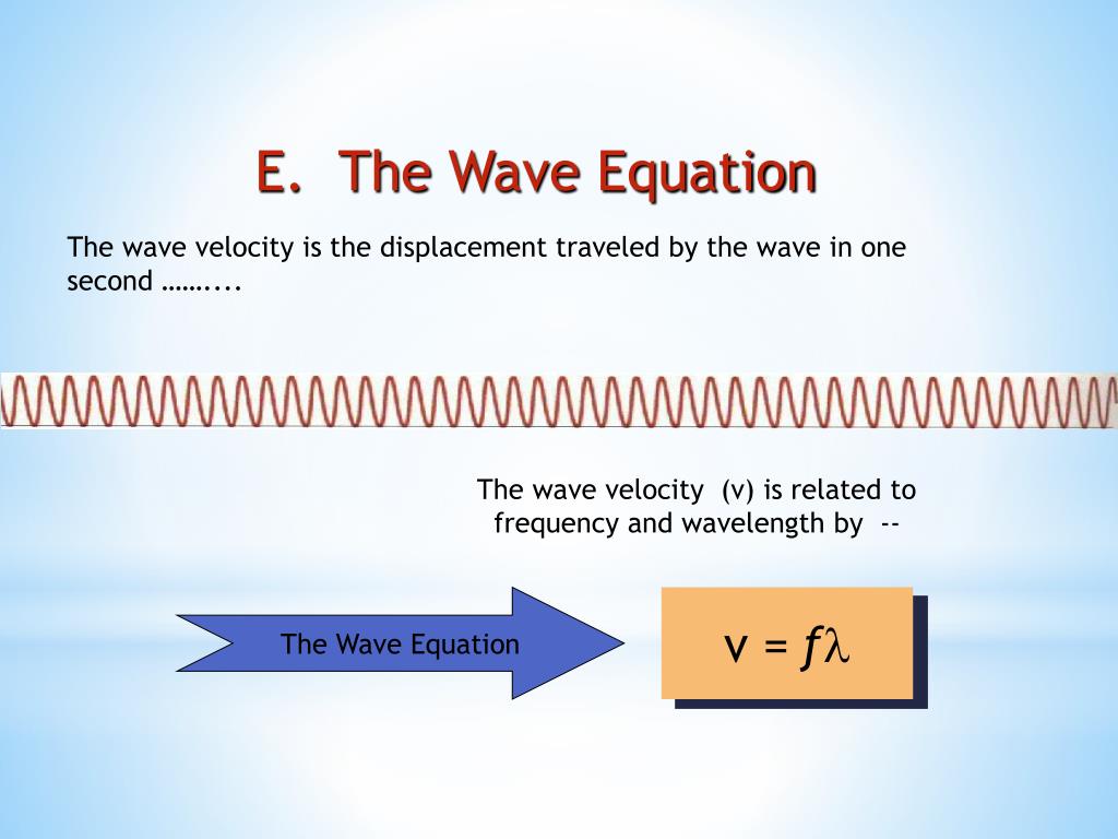 E. The Wave Equation The wave velocity is the displacement traveled by the wave in one second …….... The wave velocity (v) is related to frequency and wavelength by -- The Wave Equation v = ƒ