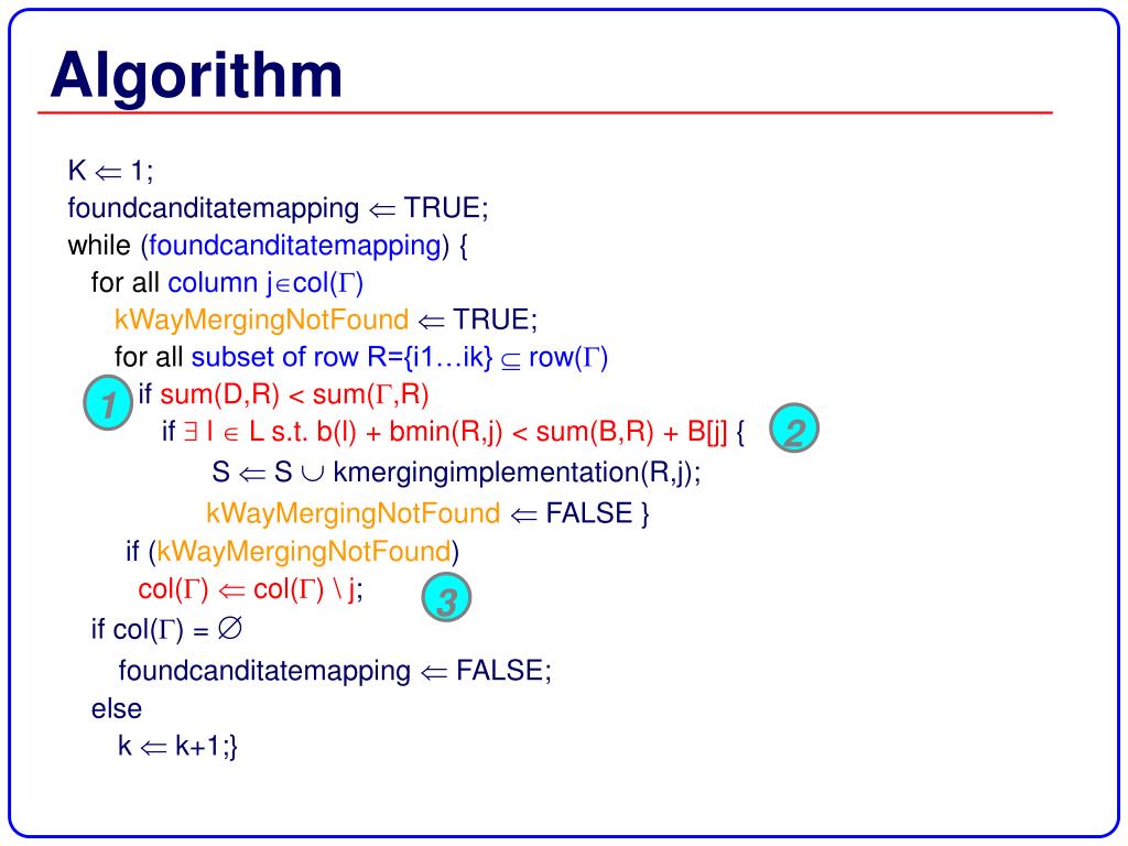 1 2 3 Algorithm K 1; foundcanditatemapping TRUE; while (foundcanditatemapping) { for allcolumn jcol() kWayMergingNotFound TRUE; for allsubset of row R={i1…ik} row() if sum(D,R) < sum(,R) if l L s.t. b(l) + bmin(R,j) < sum(B,R) + B[j] { S S kmergingimplementation(R,j); kWayMergingNotFound FALSE } if (kWayMergingNotFound) col() col() \ j; if col() = foundcanditatemapping FALSE; else k k+1;}