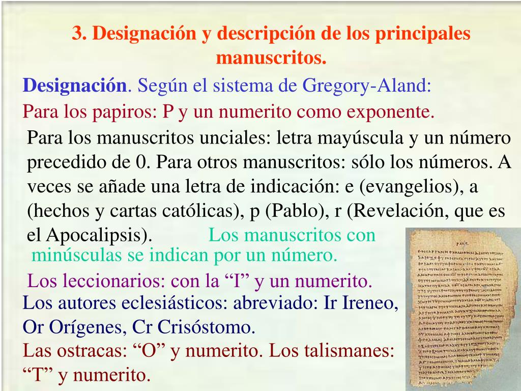 3. Designación y descripción de los principales manuscritos. Designación. Según el sistema de Gregory-Aland: Para los papiros: P y un numerito como exponente. Para los manuscritos unciales: letra mayúscula y un número precedido de 0. Para otros manuscritos: sólo los números. A veces se añade una letra de indicación: e (evangelios), a (hechos y cartas católicas), p (Pablo), r (Revelación, que es el Apocalipsis). Los manuscritos con minúsculas se indican por un número. Los leccionarios: con la “I” y un numerito. Los autores eclesiásticos: abreviado: Ir Ireneo, Or Orígenes, Cr Crisóstomo. Las ostracas: “O” y numerito. Los talismanes: “T” y numerito.