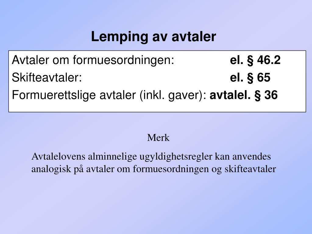 Lemping av avtaler Avtaler om formuesordningen: el. § 46.2 Skifteavtaler: el. § 65 Formuerettslige avtaler (inkl. gaver): avtalel. § 36 Merk Avtalelovens alminnelige ugyldighetsregler kan anvendes analogisk på avtaler om formuesordningen og skifteavtaler