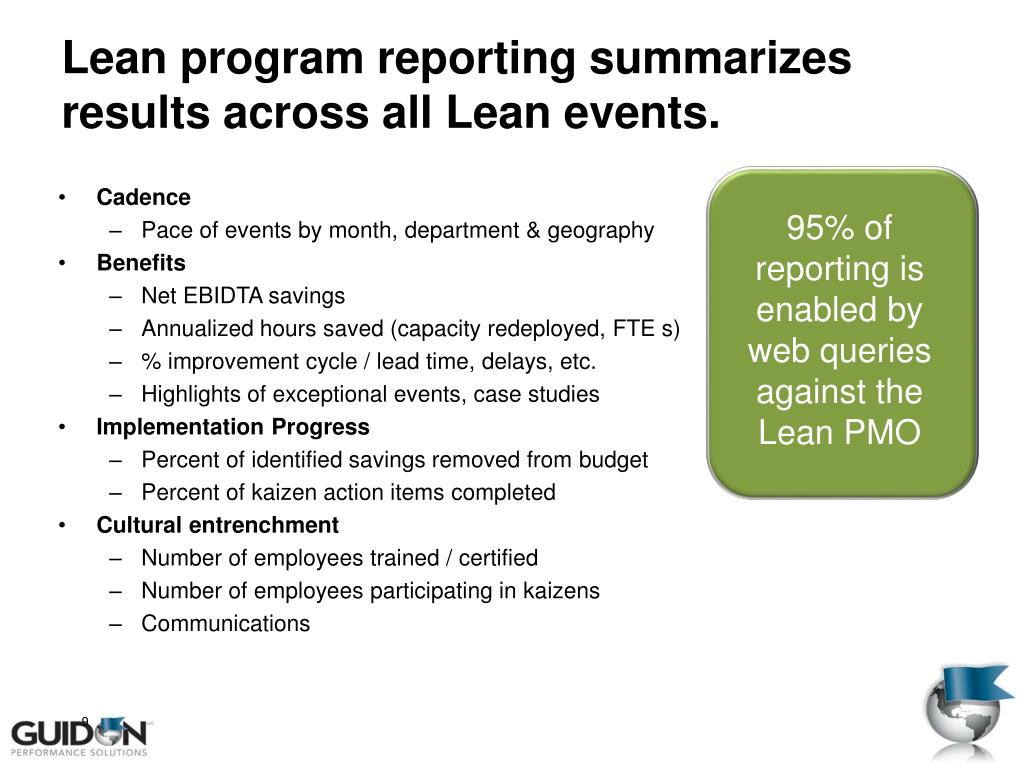 Lean program reporting summarizes results across all Lean events. • Cadence • Pace of events by month, department & geography • Benefits • Net EBIDTA savings • Annualized hours saved (capacity redeployed, FTE s) • % improvement cycle / lead time, delays, etc. • Highlights of exceptional events, case studies • Implementation Progress • Percent of identified savings removed from budget • Percent of kaizen action items completed • Cultural entrenchment • Number of employees trained / certified • Number of employees participating in kaizens • Communications 95% of reporting is enabled by web queries against the Lean PMO