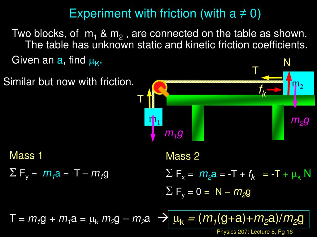 1st: Frictionless experiment (with a ≠ 0) N m2 m2g Two blocks are connected on the table as shown. The table is frictionless. Find the acceleration of mass 2. T Requires two FBDs T m1 m1g Mass 1 S Fy = m1ay = T – m1g Notice ay = ax = a Eliminate T m1a + m2a = m1 a =m1 / (m2+m1)g Mass 2 S Fx = m2ax = -T S Fy = 0 = N – m2g