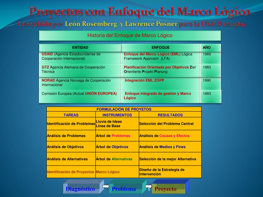 Historia del Enfoque de Marco Lógico. ENTIDAD. ENFOQUE. AÑO. USAID (Agencia Estadounidense de Cooperación Internacional). Enfoque del Marco Lógico (EML) Lógica Framework Approach (LFA). 1969. GTZ Agencia Alemana de Cooperación Técnica.