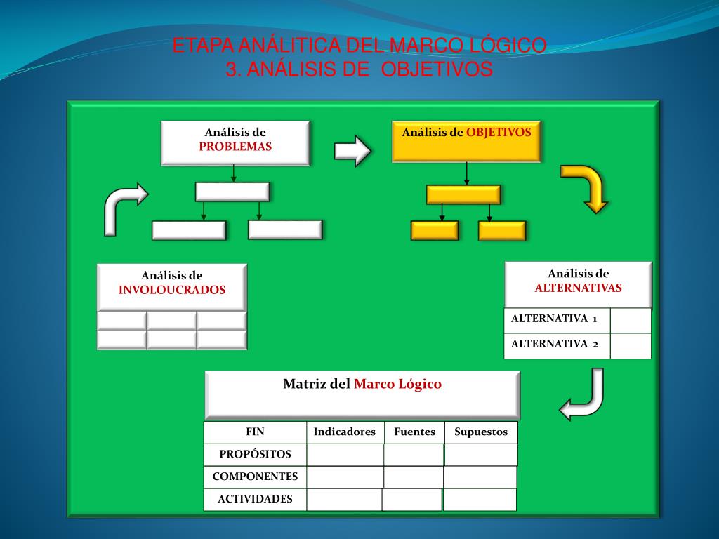Análisis de PROBLEMAS Análisis de OBJETIVOS ETAPA ANÁLITICA DEL MARCO LÓGICO 3. ANÁLISIS DE OBJETIVOS Análisis de ALTERNATIVAS Análisis de INVOLOUCRADOS ALTERNATIVA 1 ALTERNATIVA 2 Matriz del Marco Lógico Indicadores FIN Fuentes Supuestos PROPÓSITOS COMPONENTES ACTIVIDADES