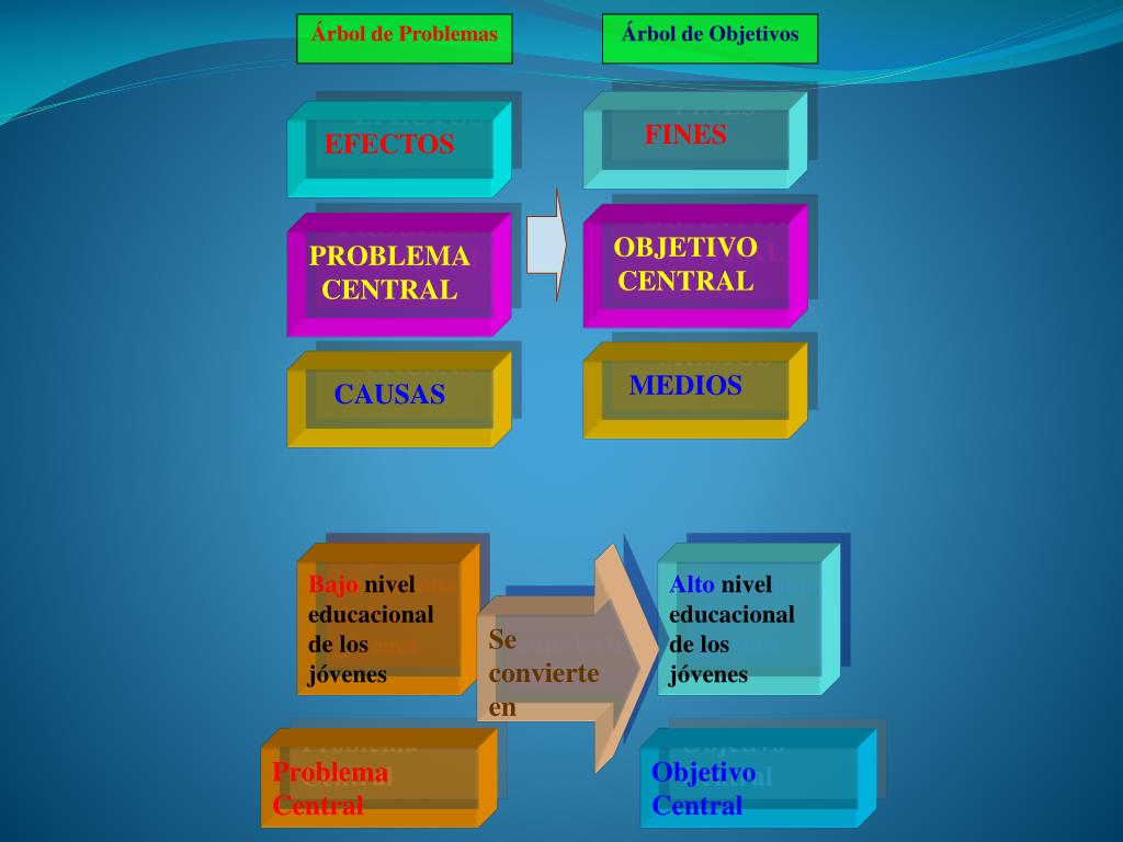 FINES EFECTOS OBJETIVO CENTRAL PROBLEMA CENTRAL MEDIOS CAUSAS Árbol de Objetivos Árbol de Problemas Bajo nivel educacional de los jóvenes Se convierte en Alto nivel educacional de los jóvenes Problema Central Objetivo Central