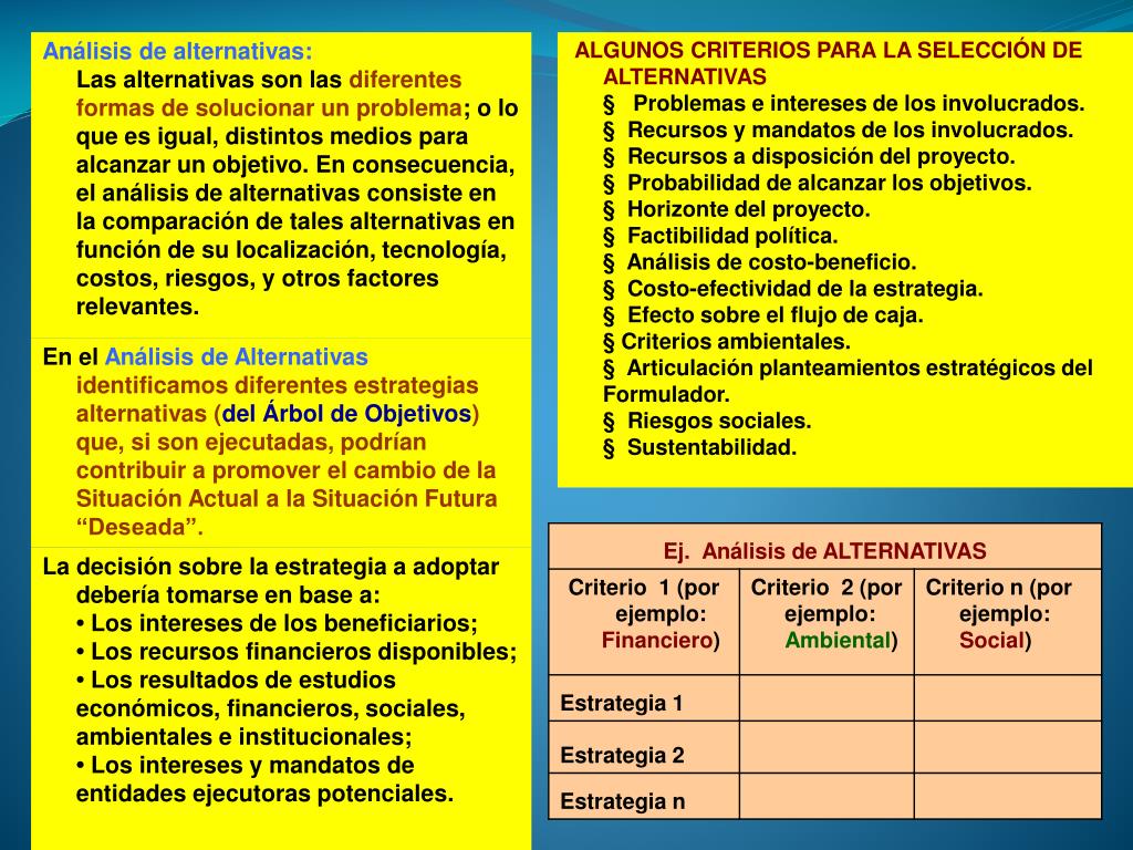 ALGUNOS CRITERIOS PARA LA SELECCIÓN DE ALTERNATIVAS§Problemas e intereses de los involucrados. § Recursos y mandatos de los involucrados. § Recursos a disposición del proyecto. § Probabilidad de alcanzar los objetivos. § Horizonte del proyecto. § Factibilidad política. § Análisis de costo-beneficio. § Costo-efectividad de la estrategia. § Efecto sobre el flujo de caja. § Criterios ambientales. § Articulación planteamientos estratégicos del Formulador. § Riesgos sociales. § Sustentabilidad.