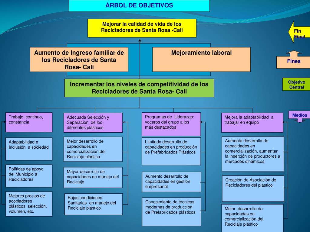 ÁRBOL DE OBJETIVOS Mejorar la calidad de vida de los Recicladores de Santa Rosa -Cali Fin Final Aumento de Ingreso familiar de los Recicladores de Santa Rosa- Cali Mejoramiento laboral Fines Incrementar los niveles de competitividad de los Recicladores de Santa Rosa- Cali Objetivo Central Programas de Liderazgo: voceros del grupo a los más destacados Trabajo continuo, constancia Mejora la adaptabilidad a trabajar en equipo Adecuada Selección y Separación de los diferentes plásticos Medios Aumenta desarrollo de capacidades en comercialización, aumentan la inserción de productores a mercadosdinámicos Mejor desarrollo de capacidades en comercialización del Reciclaje plástico Limitado desarrollo de capacidades en producción de Prefabricados Plásticos Adaptabilidad e Inclusión a sociedad Políticas de apoyo del Municipio a Recicladores Mayor desarrollo de capacidades en manejo del Reciclaje Aumento desarrollo de capacidades en gestión empresarial Creación de Asociación de Recicladores del plástico Mejores precios de acopiadores plásticos, selección, volumen, etc. Bajas condiciones Sanitarias en manejo del Reciclaje plástico Conocimiento de técnicas modernas de producción de Prefabricados plásticos Mejor desarrollo de capacidades en comercialización del Reciclaje plástico